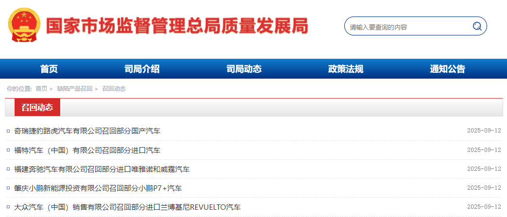 日,国度市场监视办理总局质量成长局官网显示,日前,公共、奔跑、福特、奇瑞、小鹏等车企旗下公司,均按照《缺陷汽车产物召回办理条例》和《缺陷汽车产物召回办理条例实施法子》的要求,向国度市场监视办理总局存案召回打算。