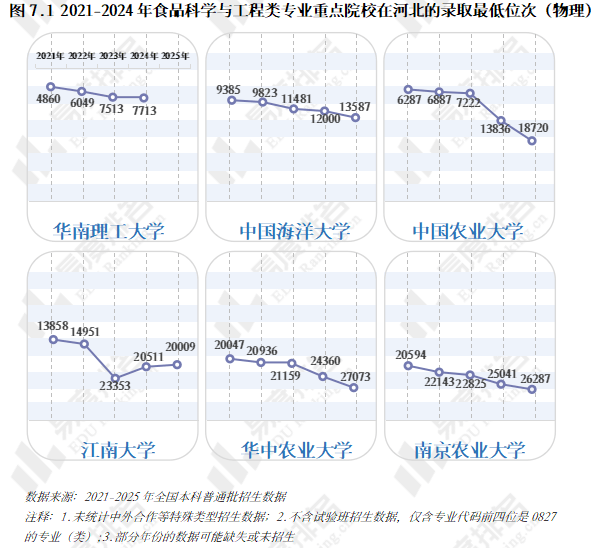华南理工大学、中国海洋大学、南京农业大学登科位次跟着招生规模扩大逐年小幅下滑,大概仍可视为不变。中国农业大学、江南大学、华中农业大学的招生调整和位次走势对比则显显露危机:中农大扩招,但位次降幅跨越打算增幅;江南大学缩招,位次小幅拉升;华农打算数不变,位次下滑。这些都必然程度上反映出该专业类位次增加乏力,似乎只能通过缩减招生规模方能维持,何况这一招一不小心还会“失灵”。