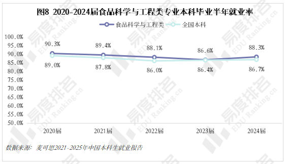 食物科学取工程类专业本科结业五年就业对劲度一直低于全国本科平均程度,差距为2%-4%,2024年差距有所收窄。