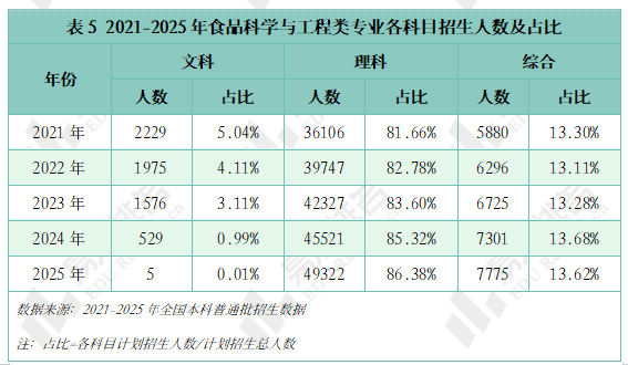 近五年食物科学取工程类专业招收文科\汗青考生的打算数逐年递减,至2025年已降至个位数,文科生报考食物科学取工程类专业的机遇曾经接近于0。理科、分析科目标招生人数则正在不竭增加。